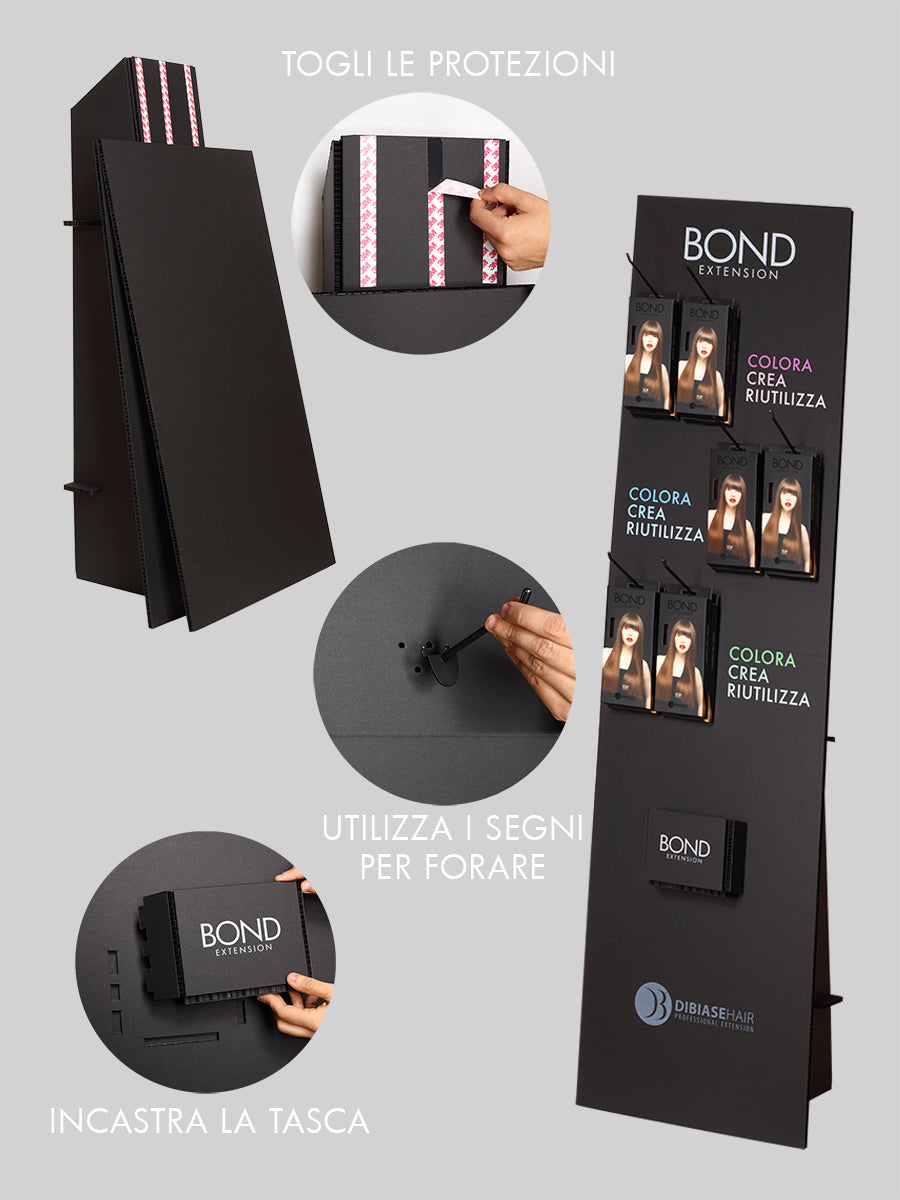 - Dai nuova vita al tuo salone con l'espositore pieghevole BOND incluso di 18 confezioni di BOND EXTENSION da 55/60 cm. Ogni confezione contiene un'extension bond dal peso di 15 grammi e larga 9 cm.